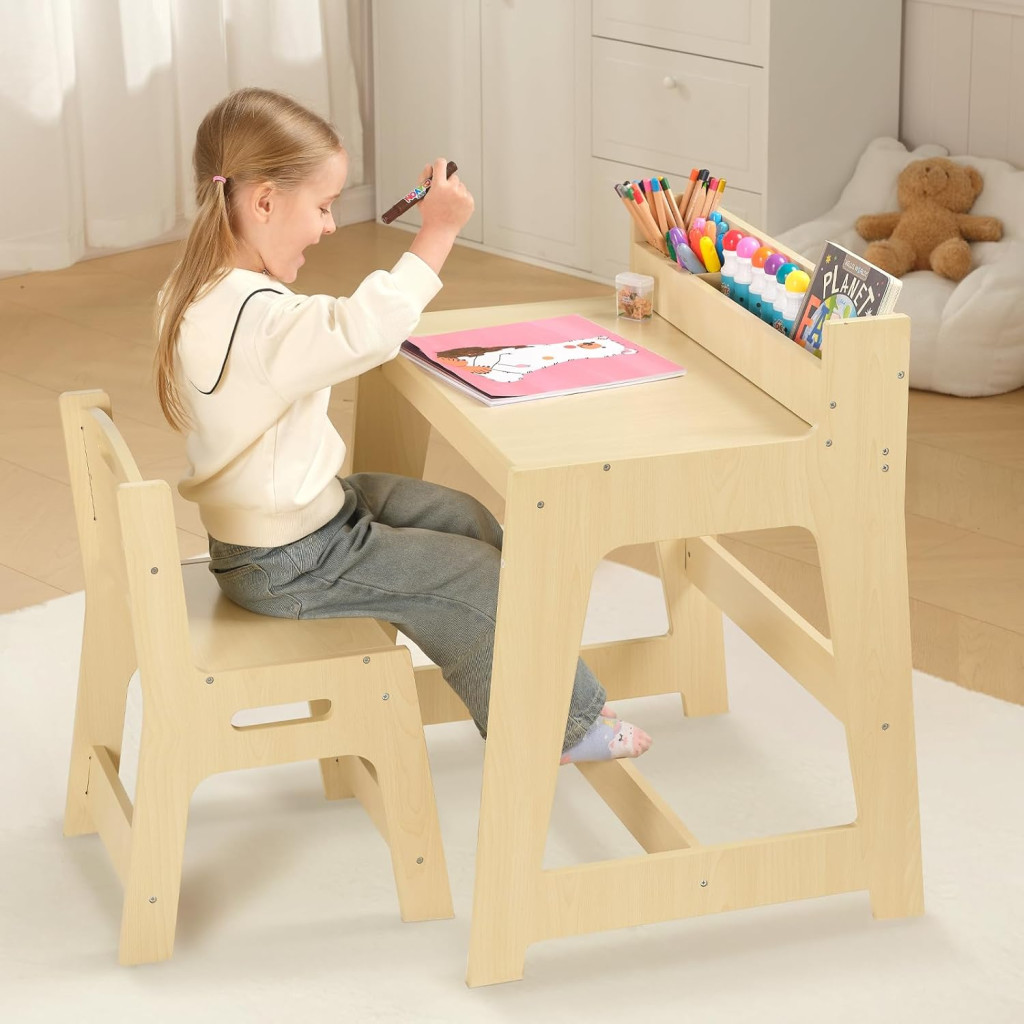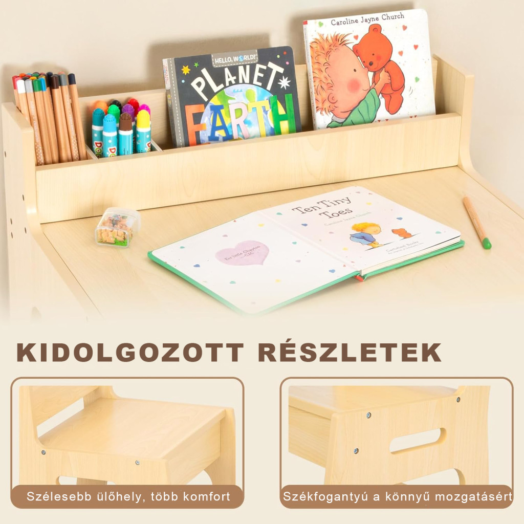 Ez a szett ideális tanuláshoz, rajzoláshoz, kreatív tevékenységekhez vagy egyszerűen egy saját kis dolgozósarok kialakításához. Tökéletes Montessori otthonokba, ahol a gyermek saját tempójában fejlődhet, saját térrel.