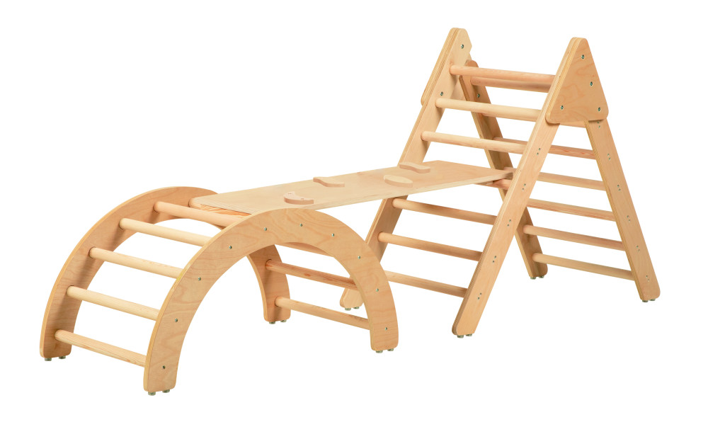 The 3-in-1 climber set with a Pikler triangle, rainbow climber, and dual-sided ramp is an excellent choice if you are looking for a toy that helps with your child's motor development while also being fun. The set includes a Pikler triangle, which is perfect for developing the little ones’ climbing abilities, and a curved rainbow climber that offers even more challenges. One side of the dual-sided ramp is smooth, while the other is equipped with climbing elements, allowing children to enjoy various play and development opportunities. This multifunctional tool is made of safe, natural wood, making it stable and durable, while its colorful design stimulates children’s imagination and encourages play. It is ideal for both indoor use and limited outdoor use!